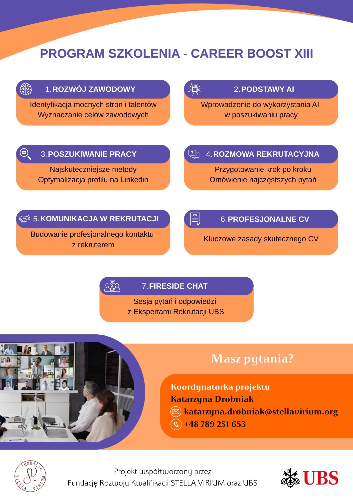 • Dwudniowe szkolenie online z doświadczonymi trenerami UBS, które pomoże Ci w tworzeniu CV, przygotowaniu do rozmów kwalifikacyjnych. Szkolenia odbędą się w dwóch grupach językowych: