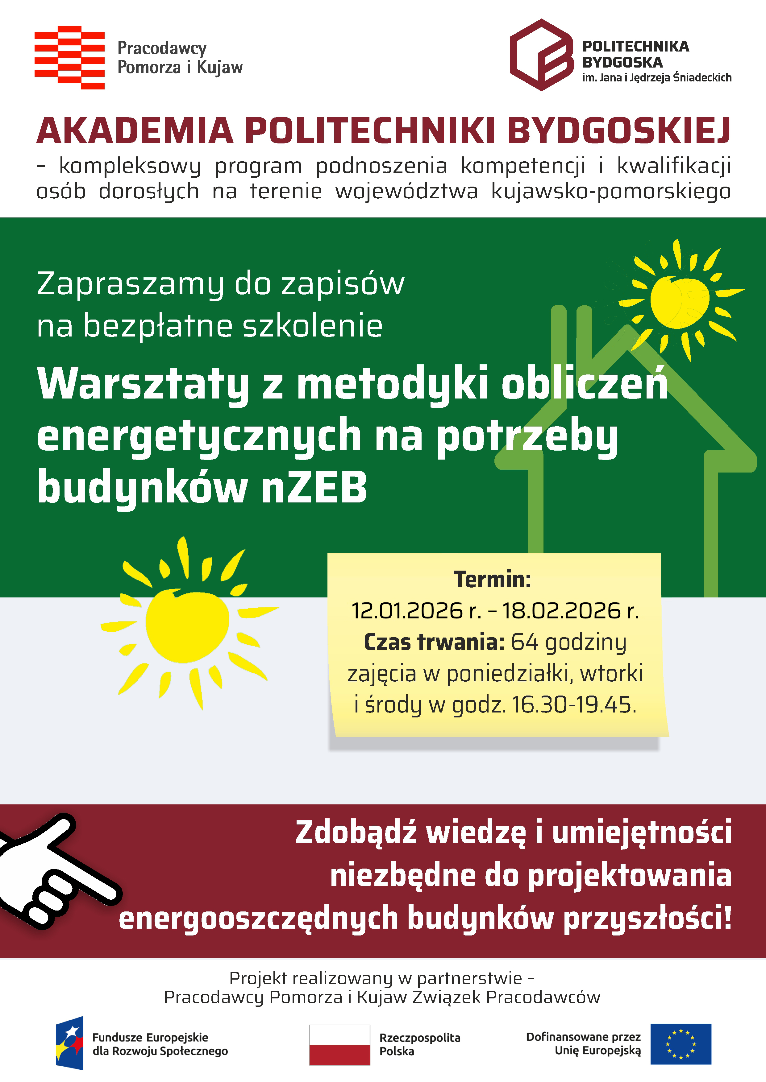 Zapraszamy do udziału w bezpłatnym szkoleniu „Warsztaty z metodyki obliczeń energetycznych na potrzeby budynków nZEB”, organizowanym w dniach 12.01.2026 r. - 18.02.2026 r.